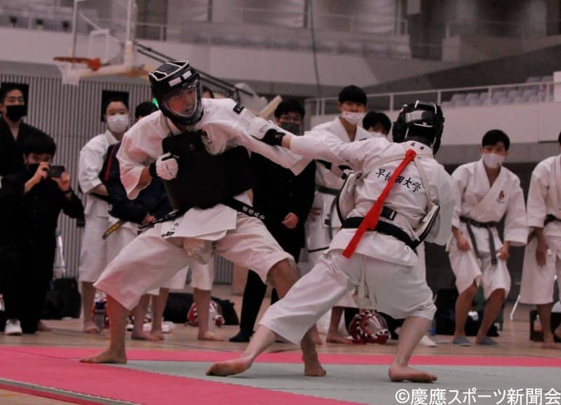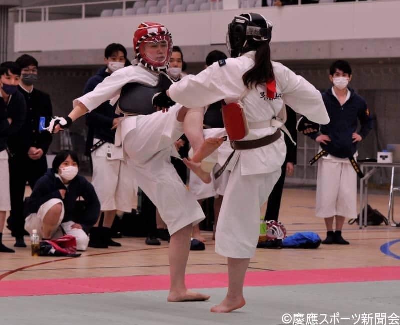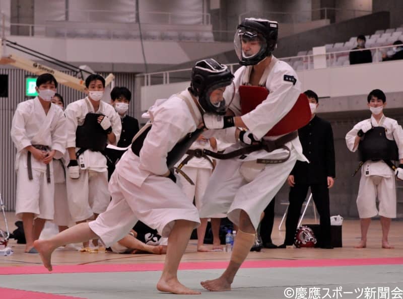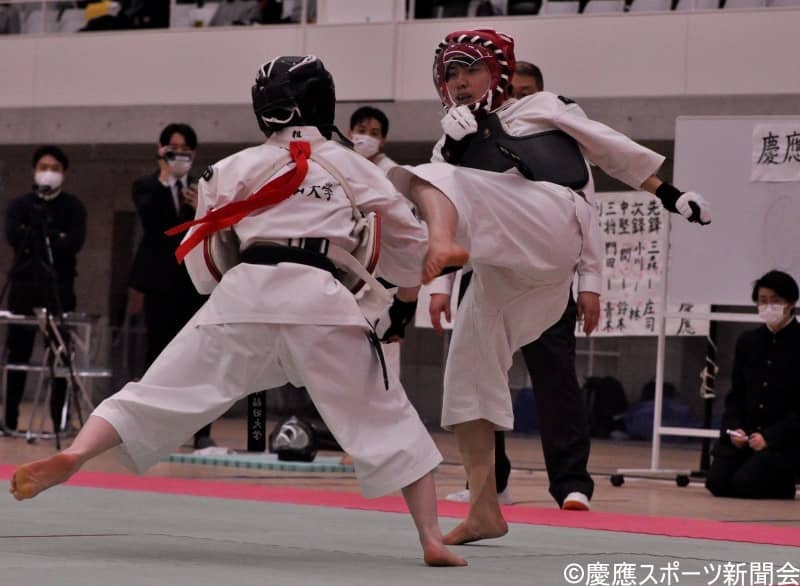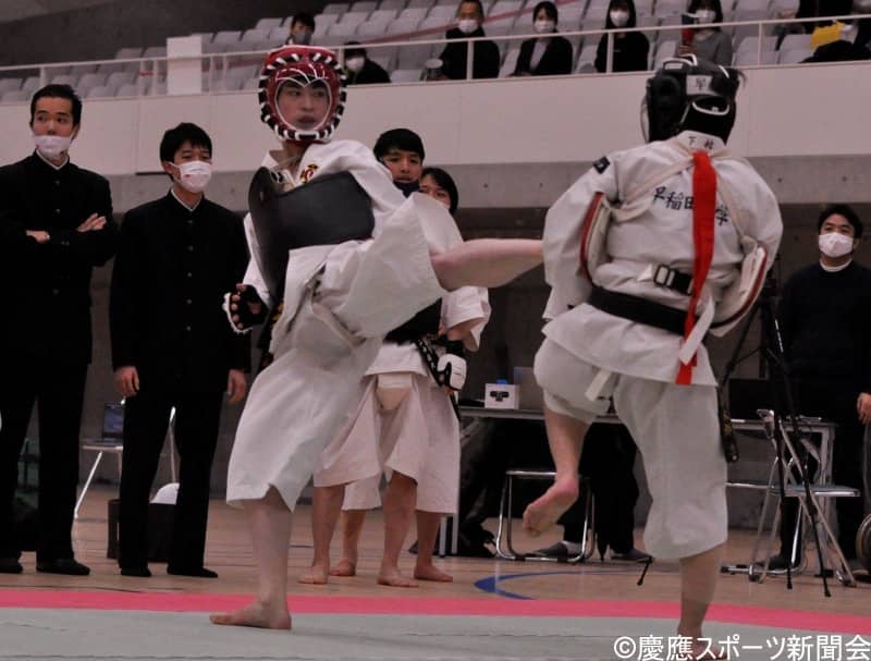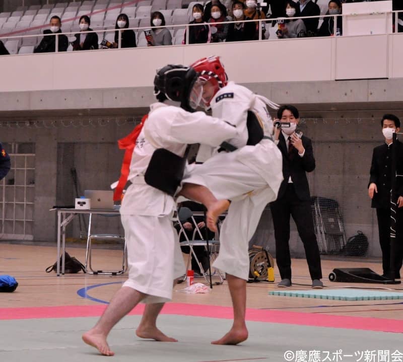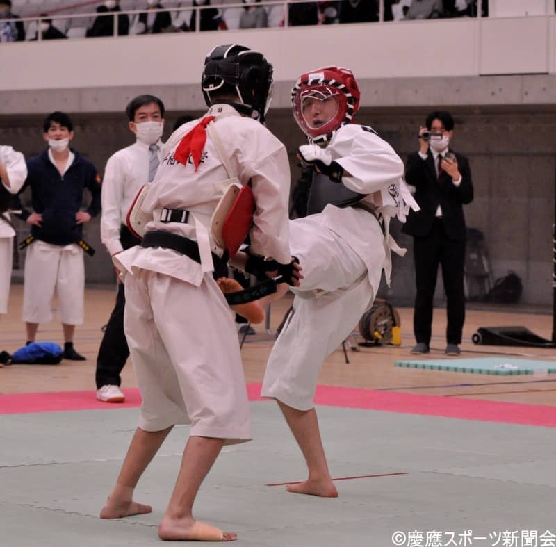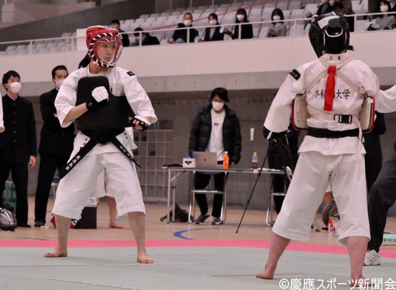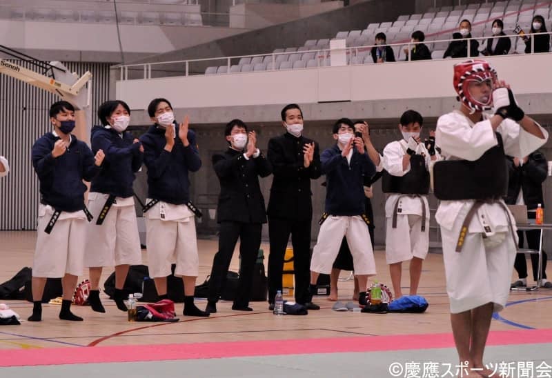 3点を先制されながらも「自分でも驚くほど」の冷静さで技を返し、前半終了間際に2点差に詰め寄る。「リラックスして自分の得意な中段突きのカウンターで逆襲しにいこう」。相手の動きに対応してからの佐藤は強かった。後半10秒、34秒にそれぞれ綺麗な中段突きを決めて、同点。残り11秒に勝ち越しの突きが決まると、会場に詰めかけた慶大ファンから大きな拍手が起こった。最後に会心の拳が相手の防具を高らかに弾いて、5―3。