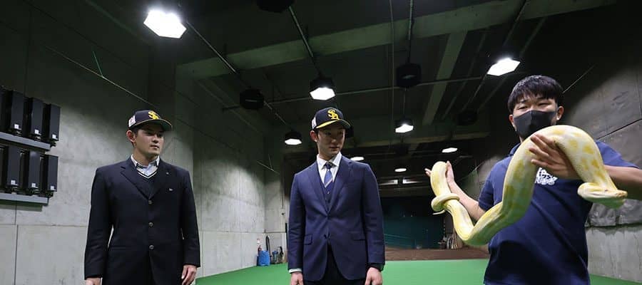 ビルマニシキヘビを見つめるソフトバンクのドラフト1位・風間球打(左)と同2位・正木智也【写真提供:福岡ソフトバンクホークス】