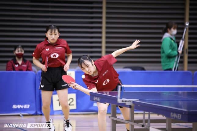 この日の早大の1番手は里川奈優(スポ2=高知・明徳義塾)。チームに弾みをつけたい里川だが、相手エース・秋山に対し、1ゲーム目から守勢に立たされる。多彩なサーブを駆使し、2ゲーム目をとるものの、3、4ゲーム目はラリーで力負け。里川は専大戦に続く無念の敗戦となった。2人目は黒野葵衣主将(スポ3=東京・武蔵野)が登場。相手の意表をつく攻撃が光ったものの、カットのミスが目立ちゲームカウント1-2のピンチに。しかし重圧がかかる終盤は、相手のミスを誘うカットマンの黒野が真価を発揮。2ゲームを連取して勝利し、試合を振り出しに戻した。続く3人目の福岡乃愛(スポ1=兵庫・三田学園)はカットと攻撃を織り交ぜた安定した試合運びを見せ、ストレートで勝利。そのまま勢いに乗りたい黒野・中島組は、前回フルセットの末勝利を収めた相手との対戦となった。しかし、「回転の変化を相手にしっかり読み取られて攻撃されてしまった」(中島)と相手に対応され、カットマン同士のダブルスの持ち味を出せないままストレート負けを喫した。