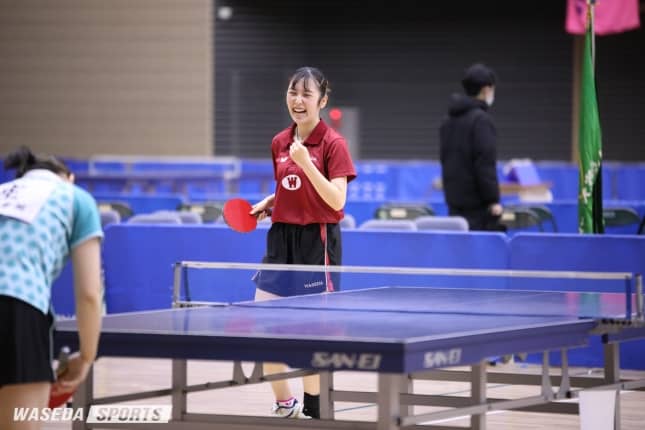 2勝2敗で迎えた5番手は曽根原睦(東京・文化学園大杉並)。サーブは効いていたが、ラリーで精彩を欠き、ゲームカウントで1-3で敗北した。相手に王手をかけられたが、続く顧琳婧(スポ1=愛知・桜丘)は相手のミスを誘うプレーでストレート勝ちを収め、3勝3敗で並ぶ。その結果、勝敗は7番の中島に委ねられた。序盤はカットマンの中島に対し、相手が攻撃を早めに仕掛けずツッツキのラリーが長く続く我慢の展開。丁寧に拾って相手のミスを待った中島が1、2ゲーム目を先取する。すると3ゲーム目から「サーバーが13本以内にポイントを決めなければ相手にポイントが入る」促進ルールが適用される。「促進ルールは苦手で、どうしようかなと迷いがあった」という中島は相手の強打に苦しめられ、接戦の末3ゲーム目を落とした。しかし、その後は立て直し、ラリーを続けつつ、要所で攻撃を決めるプレーで4ゲーム目を奪い勝利。早大は4勝3敗で青学大との熱戦を制した。