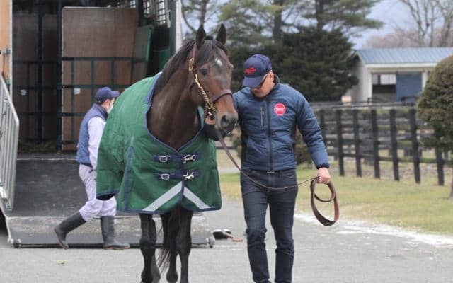 新ひだか町の競走馬総合商社(株)ジェイエスが導入した米国産新種牡馬フィレンツェファイアが14日午前、同町のアロースタッドに到着した。