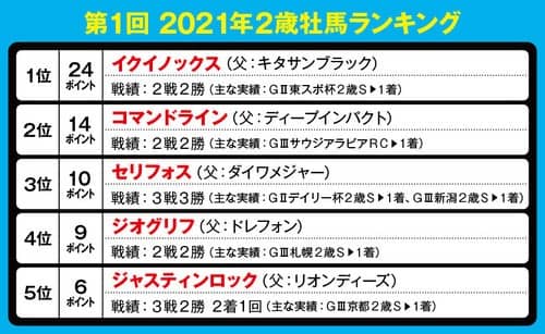 現状、牡馬も牝馬と同様、新馬、未勝利戦を勝ち上がったばかりの馬のなかにも、素質馬がたくさん控えている。年明け以降のオープン戦や重賞の結果次第では、ランキングがガラッと変わる可能性が大いにある。ともあれ、まずは今後のランキングを大きく左右するであろう、年末の2つのGI戦に注目である。