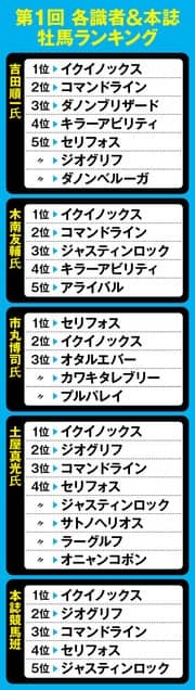 ※『Sportivaオリジナル番付』とは、デイリー馬三郎の吉田順一記者、日刊スポーツの木南友輔記者、独特なデータを駆使するパソコン競馬ライターの市丸博司氏、フリーライターの土屋真光氏、Sportiva編集部競馬班の5者それぞれが、来春のクラシックを目指す2歳牡馬の、現時点における実力・能力を分析しランクづけ。さらに、そのランキングの1位を5点、2位を4点、3位を3点、4位を2点、5位を1点として、総合ポイントを集計したもの。