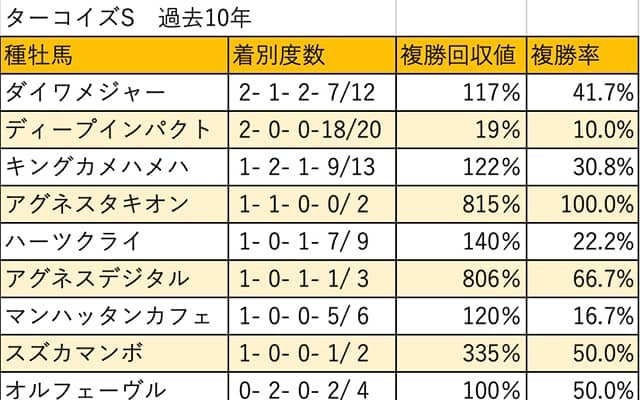過去10年で最多となる5回の馬券絡みがダイワメジャーとキングカメハメハ。次点で3回のメイショウサムソンが続き、2回がディープインパクト、アグネスタキオン、ハーツクライ、アグネスデジタル、オルフェーヴルとなっている。
