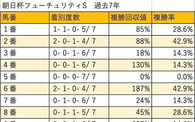 過去7年、馬番別では最多となる3回の馬券絡みが2番、6番。2回で1番、8番、10番が続く。