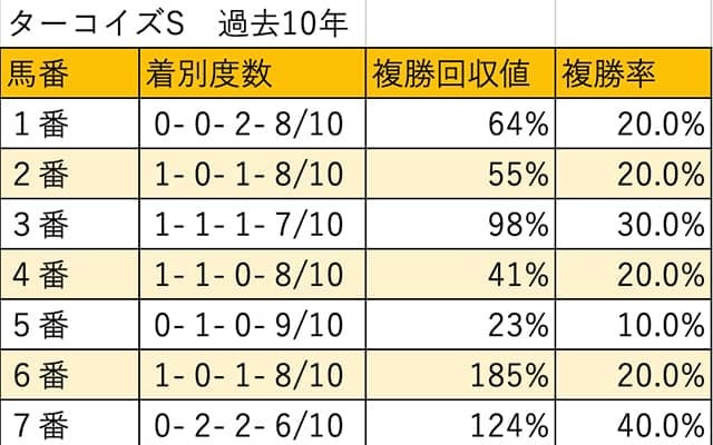 過去10年、馬番別では最多となる4回の馬券絡みが7番、8番。3回で3番が続き、2回が1番、2番、4番、6番、9番、13番、14番、15番となっている。