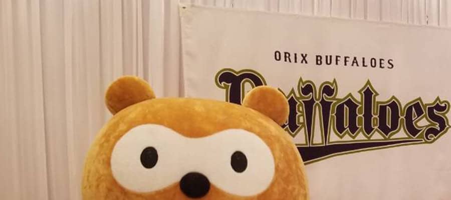 まるで山崎颯? ピンクのエプロンに青のバンダナで「お願いします」 オリックスの応援キャラクターを務める「バファローズポン…