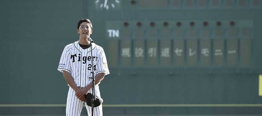 引退セレモニーであいさつする現役時代の横田慎太郎さん【写真:共同通信社】