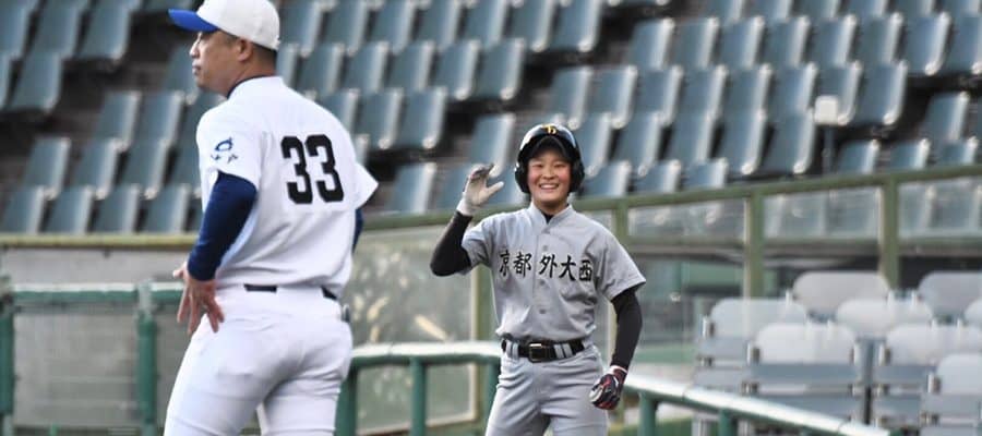 京都外大西・富田彩加さんが唯一外野に打球を運ぶ中前打を放つ マリナーズのイチロー氏(会長付き特別補佐兼インストラクター)…