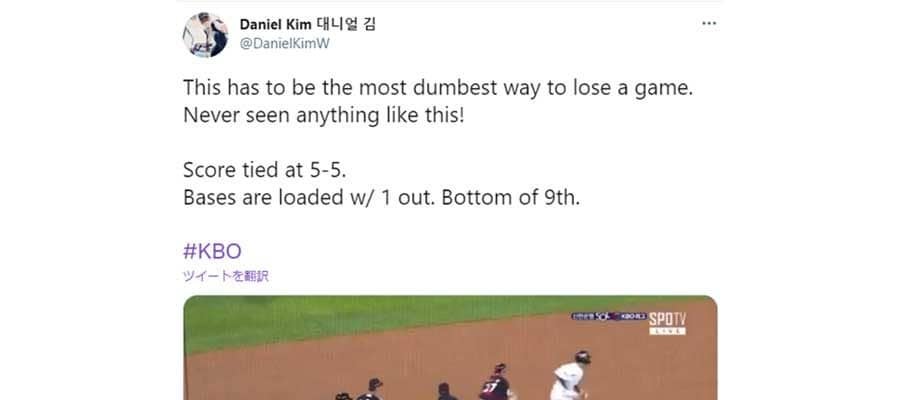 韓国プロ野球で起きた珍場面に再脚光(画像はダニエル・キム氏のツイッターより)