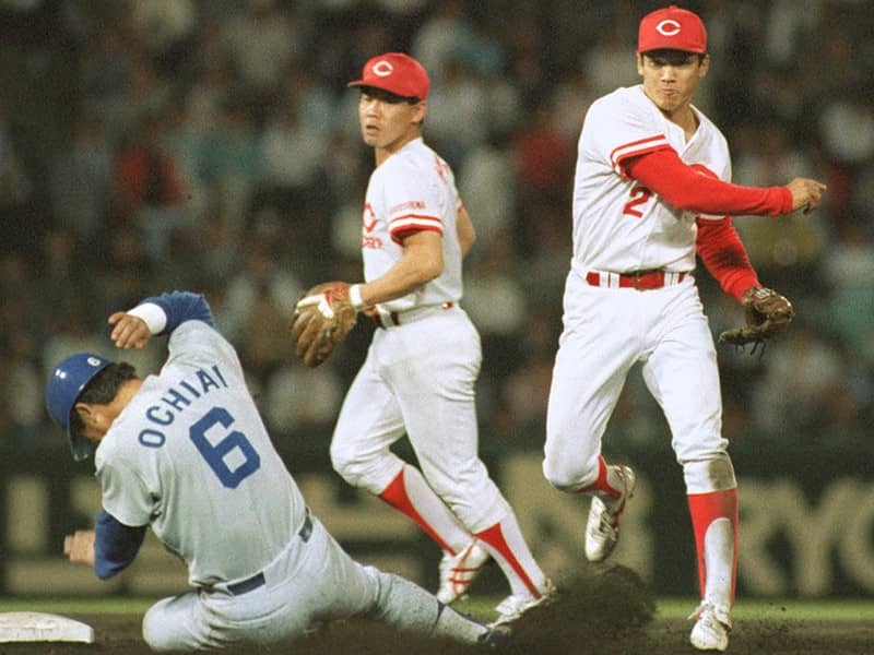 カープ黄金期の二遊間を守った正田耕三(中央)と高橋慶彦(右)