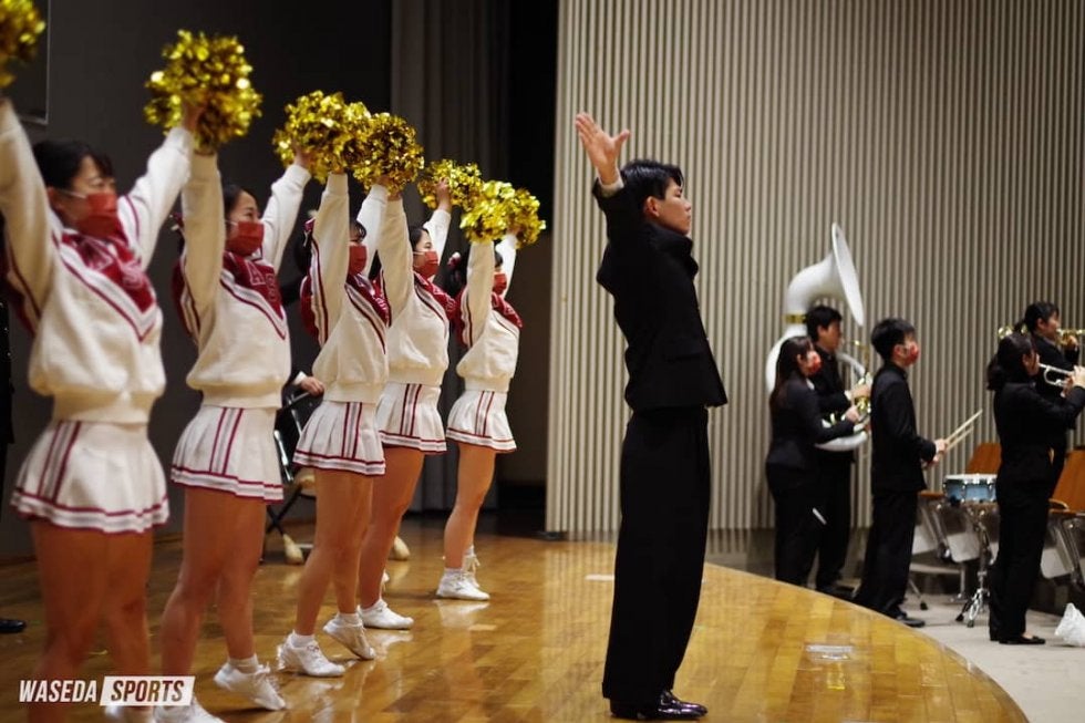 新型コロナウイルス感染症の影響により、今大会も現地応援が中止となったため、競走部員へのエールを直接送る唯一の機会となった今回の激励会は『紺碧の空』で幕を開けた。木部昌平応援企画責任者(教3=埼玉・昌平)がセンターリーダーを務め、吹奏楽団、チアリーダーズと共に迫力ある一曲目となった。続く応援歌メドレー、冒頭の学生注目(学注)では、江渕太朗代表委員主務(文3=東京・海城)が、「共に走っていく」意味を込めて、競走部を「共走部」と擬え、競走部への愛を叫んだ。学注の後には、『ダイナマイトマーチ』を交えた応援曲メドレーを披露。競走部員も手拍子で盛り上がり、エールを受け取った。「箱根にとどろく風となれ」の文字切りでメドレーを締めくくった。