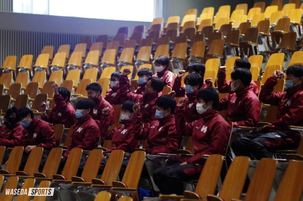 齋藤巽代表委員主将(教3=青森)による『早稲田大学校歌』一番の後には齋藤から日本酒、横田奈々応援企画責任者(教3=東京・明大附属明治)からは、早大生からの応援メッセージが書かれた襷が贈答された。その後の木部からの挨拶の中では、激励会開催への感謝、箱根駅伝総合優勝への祈願を口にした。競走部の半澤黎斗副将(スポ4=学法石川)による代表挨拶も続いて行われ、箱根駅伝での躍動を誓った。最後の記念撮影では、応援部員、競走部員の笑顔も見られ、和やかな雰囲気で激励会は終了した。直接応援に行くことが叶わない中で、応援企画部門を中心に3パート一体となり激励会を全力で盛り上げた。どんな状況になっても、選手にエールを届けるという応援部の80年以上変わらない姿を新体制初日にみた。新たな歴史を刻むこの一年に大いに期待したい。