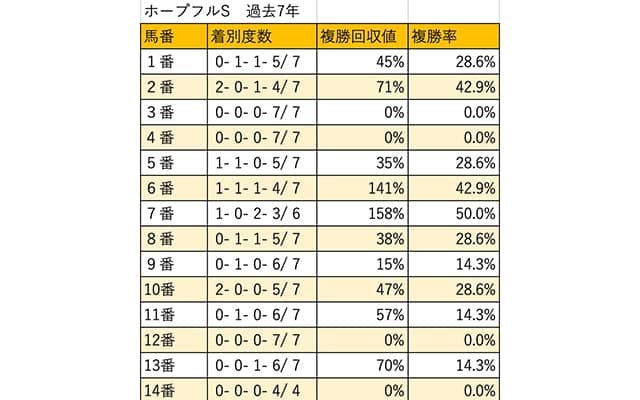 過去7年、馬番別では最多となる3回の馬券絡みが2番と6番と7番。2回で1番、5番、8番、10番が続く。