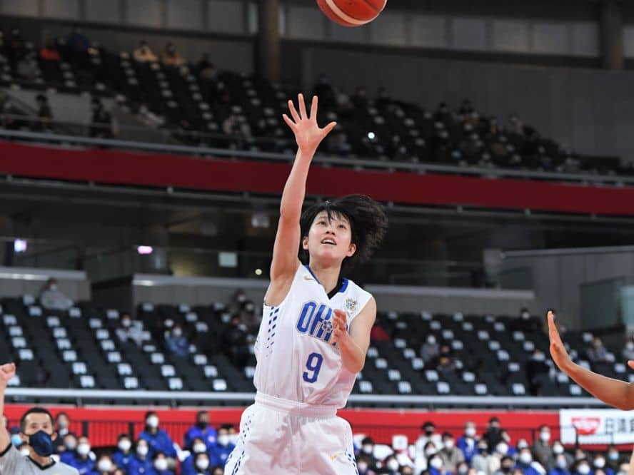 バランスの良いチームバスケが機能した中でも突出した働きを見せたのが、下級生で唯一スタメンに名を連ねる横山智那美だ。フィールドゴール18本中11本成功の25得点に加えて、6アシストも5スティールもゲームハイの数字。8リバウンドも朝比奈あずさと前田心咲と並んでトップ。数字だけではなく、堅守からのトランジションを引っ張る存在感も光った。