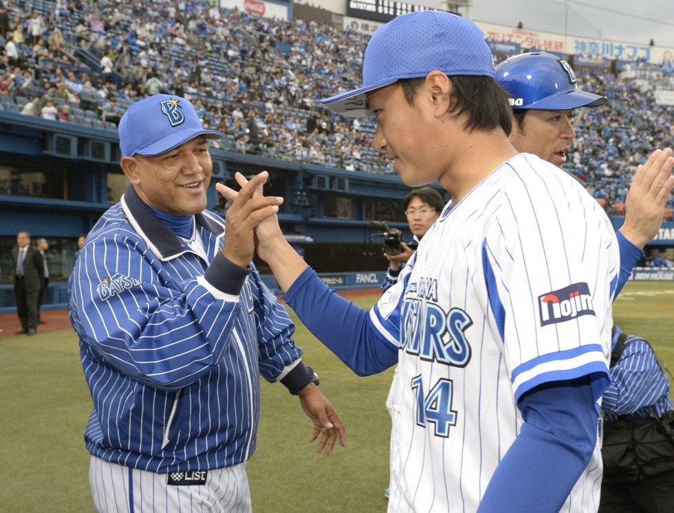 中日に勝利し、石田(右)とタッチするDeNAのラミレス監督=横浜【写真提供:共同通信社】