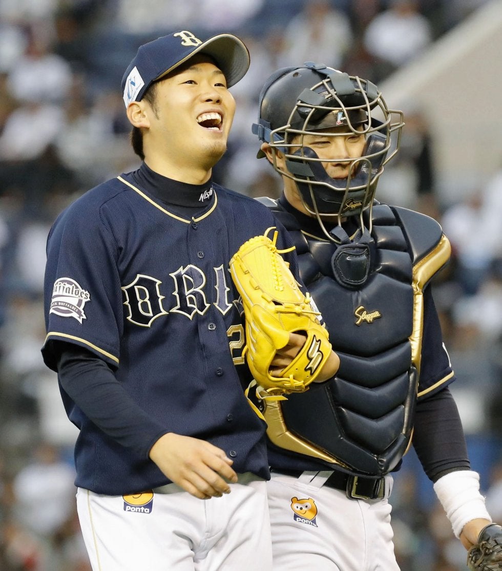 ロッテ―オリックス 8回を投げ終え、笑顔でベンチに戻るオリックス先発の西。捕手若月=ZOZOマリン【写真提供:共同通信社】