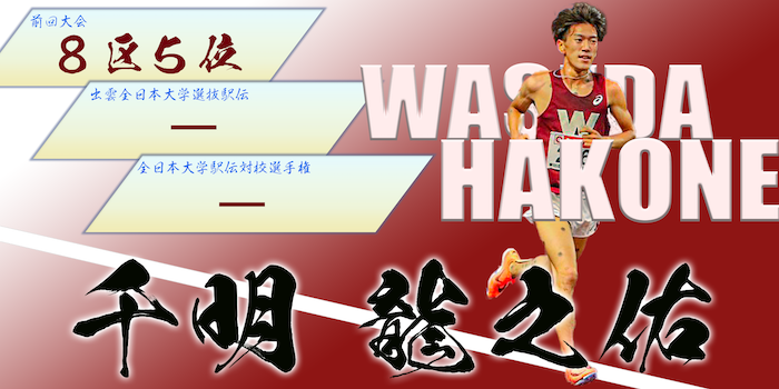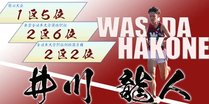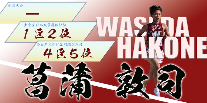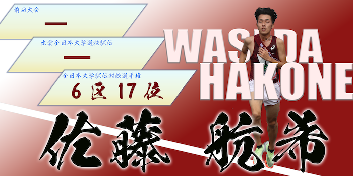 入学後1年間はケガで思うように練習できない日々が続いていたが、同期や先輩に刺激をもらいながら地道な練習を重ね、今季は飛躍を遂げた。競技・授業とも常に一緒だという菖蒲と同時に達成した5000m自己新を皮切りに、エンジデビューの関カレハーフマラソンでは、集団を引っ張りながら日本人3位に入賞。大学駅伝にも全日本で初めて選出された。しかし、その直前期に『体が動きすぎた』ことも原因として考えられる腹斜筋の痛みを発症し、本番で力を出し切れず、悔しさの残るレースとなった。箱根でのリベンジに向け、気持ちと体の状態は順調に仕上がった。『ロード最強』と呼ばれる男が大舞台で雄姿を見せつける。