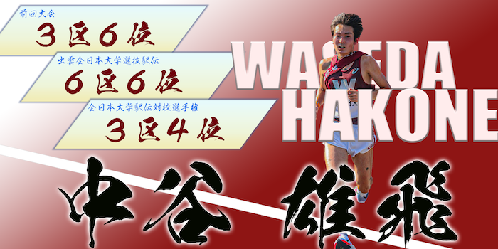 学生最後のシーズンは、結果を残すこと、さらには早大記録を狙いたいと意気込んでいた。しかし関カレで足を痛めてからは、足の状態が100パーセント完治する前にレースに出ていたこともあり、途中棄権もしばしば。エースとして注目されながらもどかしさも募り「悔しさは常に抱えていた」という。今季の駅伝では4年生で唯一出雲・全日本ともに出場した中谷は6位という順位に悔しさをあらわにした。「今回(の箱根)は、中途半端な順位はいらない。守って3位とか6位で終わるぐらいなら、最初から最後まで攻めていきたい」と覚悟を決めて箱根に挑む。希望するエース区間でも「攻めのレース」を展開するか。