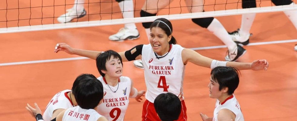女子1回戦 氷上(兵庫)-古川学園(宮城) 第1セット、得点に喜ぶ古川学園のタピア・アロンドラ(4)ら =5日、東京体育館(桐山弘太撮影)