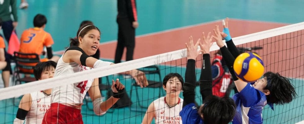 【古川学園-帝京三】第2セット、スパイクを放つ古川学園のタピア・アロンドラ(4)=6日、東京体育館(甘利慈撮影)