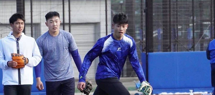 新人合同自主トレで汗を流したDeNA・小園健太(中央)【写真:宮脇広久】