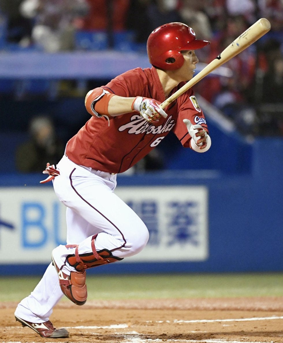 8回広島1死満塁、代打西川が右中間に勝ち越しの2点二塁打を放つ=神宮【写真提供:共同通信社】 広島東洋が7対4で東京ヤク…