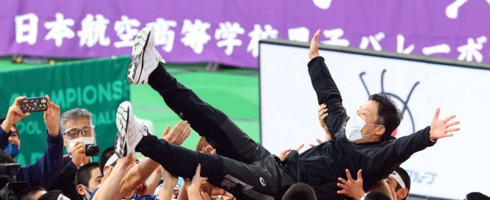 胴上げされる日本航空の月岡裕二監督=9日、東京体育館(桐山弘太撮影)