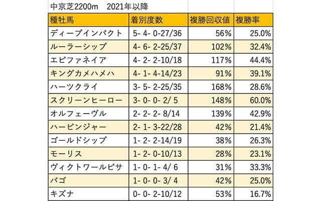 エピファネイア産駒は[4-2-2-10]。通算でも[6-2-2-12]、勝率27.3%・複勝率45.5%と高い好走率を示しているが、人気の内訳をみると1〜7人気[6-2-2-7]、8人気以下[0-0-0-5]と極端な人気薄には期待しづらい。同産駒からはクラヴェルが出走を予定している。