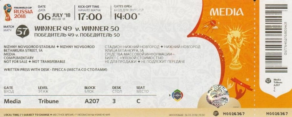ロシアW杯準々決勝、フランス対ウルグアイ戦の入場券 提供/後藤健生