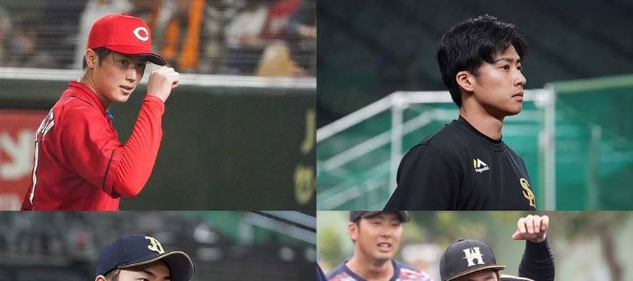 広島・森下暢仁、ソフトバンク・板東湧梧、日本ハム・高山優希、オリックス・山岡泰輔(左上から時計回り)【写真:荒川祐史、石川加奈子】