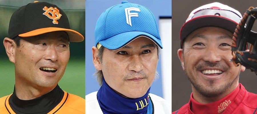 巨人・桑田真澄1軍投手チーフコーチ、日本ハム・新庄剛志監督、広島・菊池涼介(左から)【写真:荒川祐史】