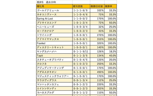 過去10年で最多となる3回の馬券絡みがゴールドアリュール。2回でネオユニヴァース、Spring At Last、プリサイスエンド、キングカメハメハ、Tapitが続く。なお、データ集計期間外も含め、現行コースの根岸Sで2頭以上の勝ち馬を出した種牡馬はプリサイスエンドに限られる。