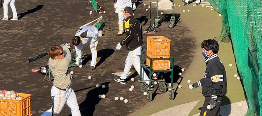 ティー打撃では城島アドバイザーが甲斐の正面に立つ場面もあった。一見すると危険そうに見える練習だが、「ちゃんとした打ち方をすれば、あそこ(城島さんの方)には飛ばないようになっているんです。見て、良い、悪いを教えてくれるので分かりやすいです」と甲斐。日に日に打撃の感触が良くなっているのを実感していた。(福谷佑介 / Yusuke Fukutani)