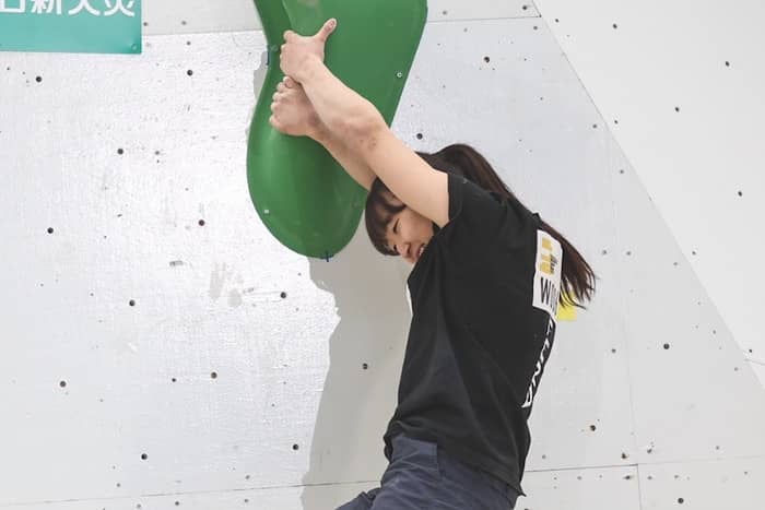 「完登できた課題はトライ回数を少なく登れたので、そこは成長を感じられて素直にうれしく思う。昨日感じた普段と大会との感覚のズレを修正できて、トライ前からどういう姿勢で臨むのかはっきりしたことがその要因だと思う。(大会前に話していた「男子化計画」と今回の成長は結び付く?)パワー系や押し切る能力が上がっていることはもちろんあると思うが、もっと高強度で、何回でも何日でも打ち込んでやっとできるような課題に取り組んでいるので、(トレーニングより)レベルの下がった課題でトライ回数少なく登れるようになったのはそれもある思う」