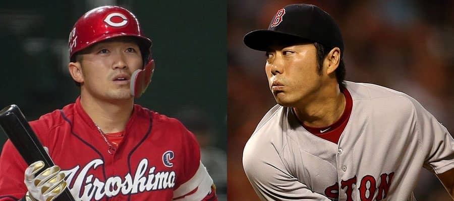 広島・鈴木誠也(左)とレッドソックス時代の上原浩治氏【写真:荒川祐史、Getty Images】