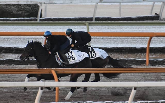 共同通信杯に向けて追い切りを行うダノンスコーピオン(内・撮影:井内利彰)