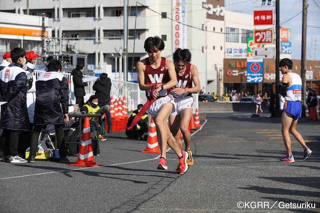 2区中谷からタスキを受け取る太田(左)(©︎関東学連/月刊陸上競技)