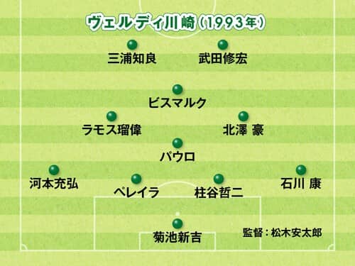 1993年のチームは"闘将"柱谷哲二とブラジル人DFペレイラの鉄壁の守備をベースに、中盤はラモス瑠偉を中心に運動量を誇る北澤豪、元セレソンのビスマルクという豪華布陣。そして、Jリーグ発足を前にブラジルから帰国した三浦知良(カズ)とゴールハンターの武田修宏が2トップを組むバランスの取れた布陣だった。