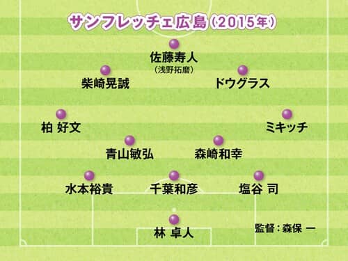 日本で攻撃型サッカーが広まるきっかけを作ったペトロヴィッチ=森保体制の広島にとって、欠かせないボランチとして戦術眼のある森崎和幸と青山敏弘が活躍。両ウイングバックのミキッチや柏好文がすばらしいパフォーマンスを見せ、点取り職人の佐藤寿人が毎シーズン2桁得点を記録。2015年には中山雅史の持つ当時のJ1最多得点記録に並んだ。