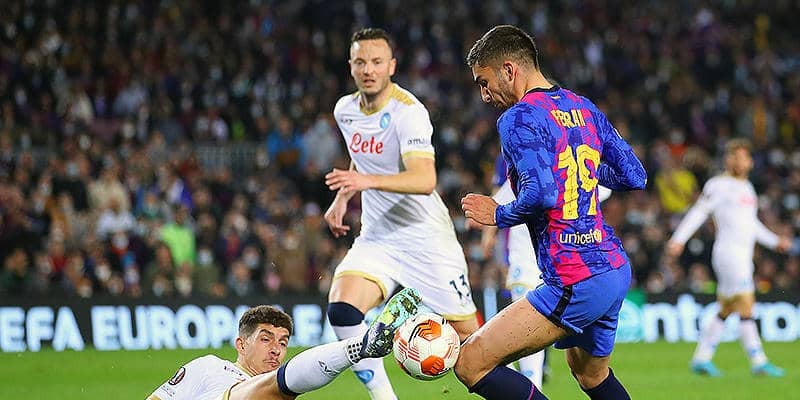 前から圧力をかけるナポリに対して安定したビルドアップでうまく前進していくバルセロナは、開始5分に左サイドでの繋ぎからボックス手前中央でボールを受けたペドリが良い形でシュートを放つが、これは枠を捉え切れない。