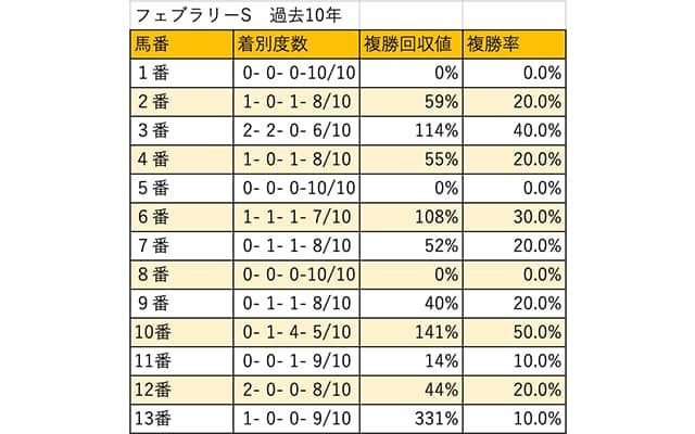 20日に東京競馬場で行われるフェブラリーS(4歳上・GI・ダート1600m)について枠順・馬番別に検証していく。 過…