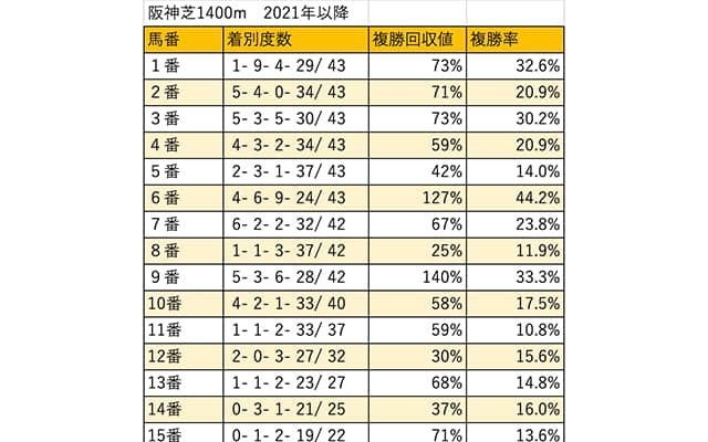 19日に阪神競馬場で行われる京都牝馬S(4歳上・牝・GIII・芝1400m)について枠順・馬番別に検証していく。なお…