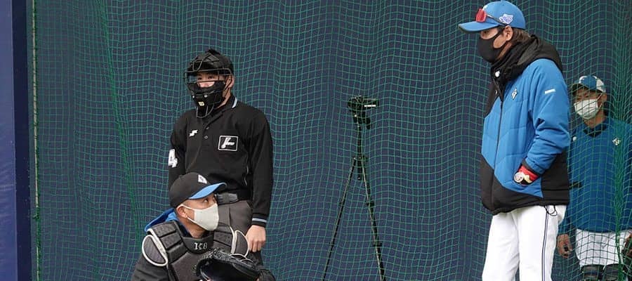日本ハムの沖縄・名護キャンプで20日、“谷繁塾”が開校した。ブルペンに集結した6人の捕手が、元中日監督・谷繁元信氏が実演したキャッチングを真剣な表情で見つめ、話に耳を傾けた。1時間以上に及ぶ貴重な指導を実現させたのは、新庄剛志監督の強い希望だった。