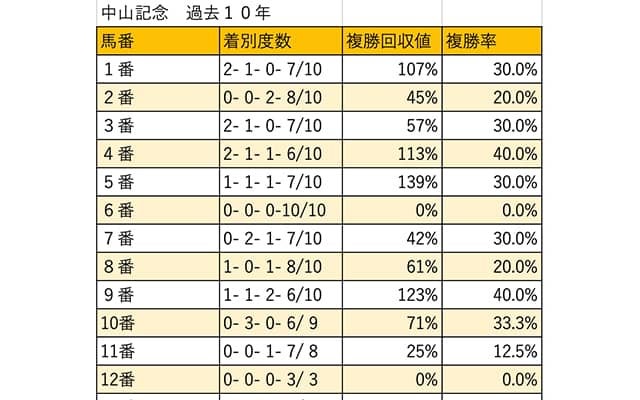 27日に中山競馬場で行われる中山記念(4歳上・GII・芝1800m)について枠順・馬番別に検証していく。 過去10年…