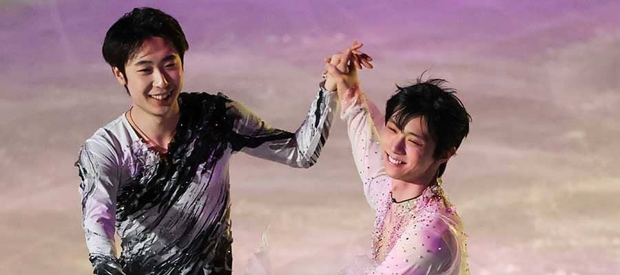 北京五輪のエキシビションでも仲の良い姿を見せたボーヤン・ジンと羽生結弦(右)【写真:Getty Images】