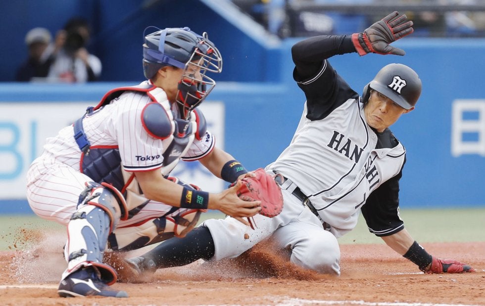 ヤクルト―阪神 8回阪神1死一、三塁、鳥谷の一ゴロが野選となり生還する三走糸井。捕手中村=神宮【写真提供:共同通信社】…