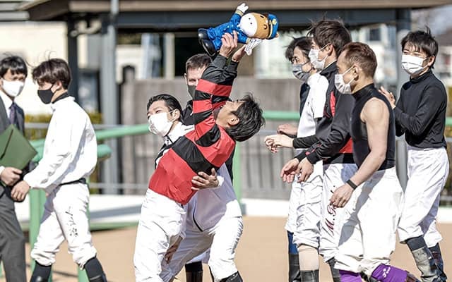 メモリアル勝利をあげ、多くの騎手に祝福された田中勝春騎手(撮影:下野雄規)