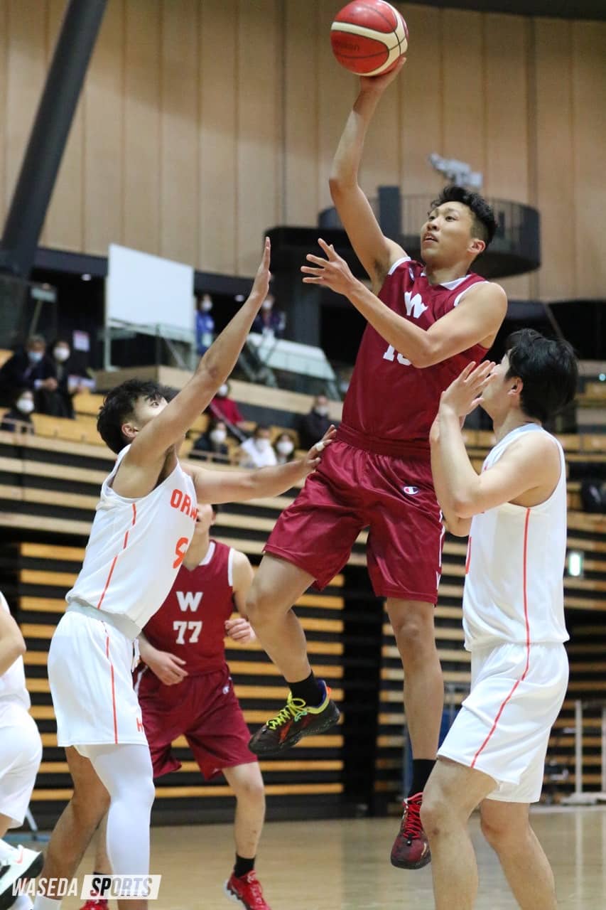 将来のチームを担う1、2年生が出場して戦う、関東大学新人戦が開催された。早大は開幕したこの日、2部リーグに所属している法大と対戦した。試合は、早大が先制するとその後もリードを許すことなく試合が進むが、第2クオーター(Q)の終盤に逆転を許してしまう。第3QではF小野功稀(社1=新潟・開志国際)がスリーポイントシュートで2点を勝ち越すも、すぐに再び逆転される。しかし第4Qには兪龍海(スポ2=神奈川・桐光学園)がスリーポイントシュートを決めるなど躍動し、残り45秒でファウルをもらうと2本のフリースローを決め1点の勝ち越しに成功。そのまま勝利した。