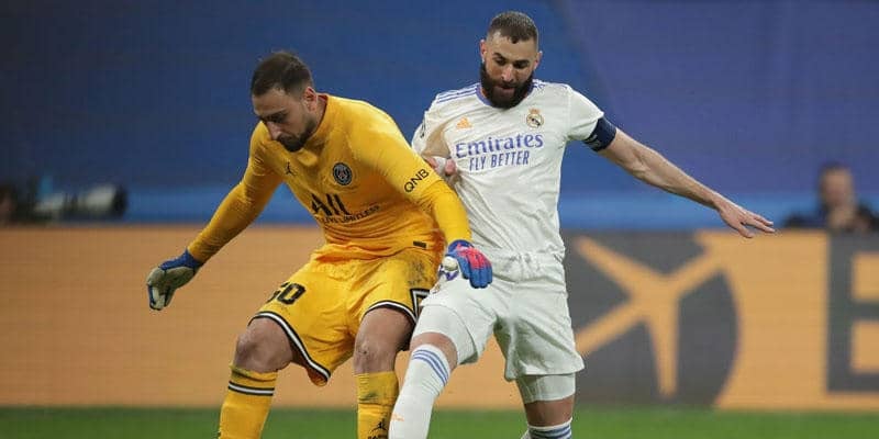 PSGのDFヌーノ・メンデスがドンナルンマにバックパス。ここにマドリーのFWベンゼマがプレッシャーをかけると、ドンナルンマが処理にもたつきボールロストする。
